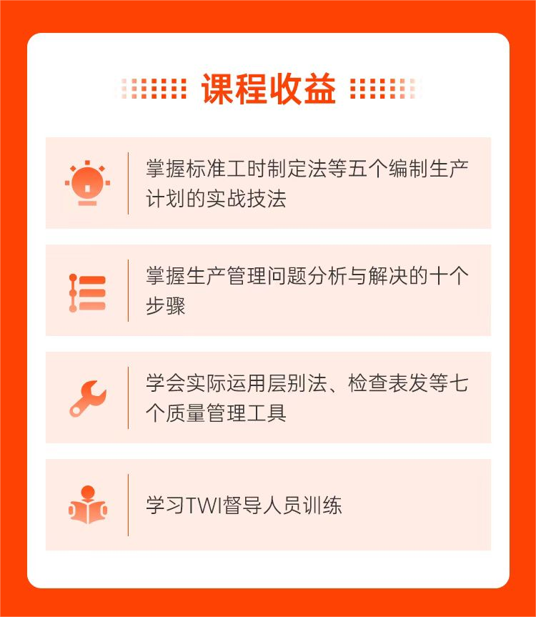 參加課程的學員,除了質量經理主課程外附帶配套四堂質量生產實用課程: